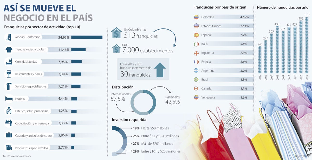 Las franquicias se han vuelto un negocio redondo en Colombia y su auge viene creciendo como la espuma, prueba de ello está en que en nueve años las mismas aumentaron su número a 270, pasando de tener 243 en 2005 a 513 el año pasado.