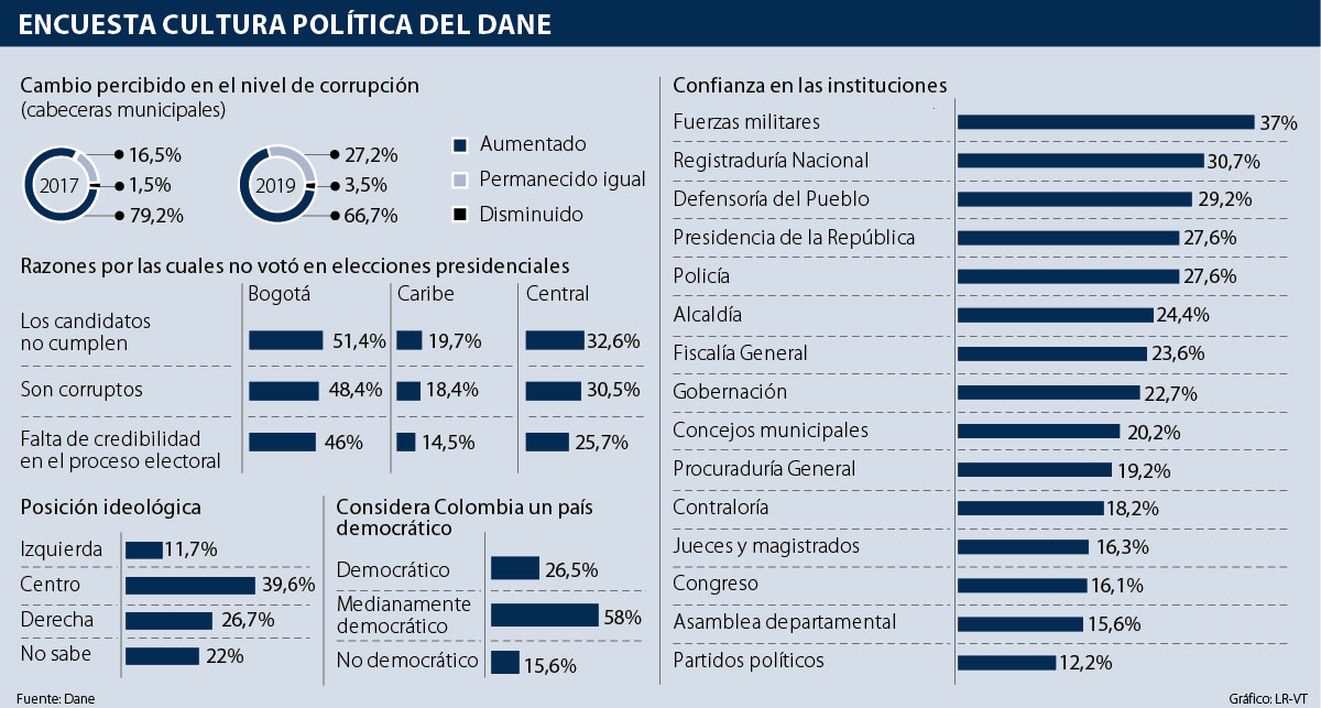 El Departamento Administrativo Nacional de Estadística (Dane) presentó los resultados de la Encuesta de Cultura Política 2019, la cual tiene como objetivo generar información sobre la percepción y prácticas de los colombianos de 18 años y más, sobre su entorno político y social.
