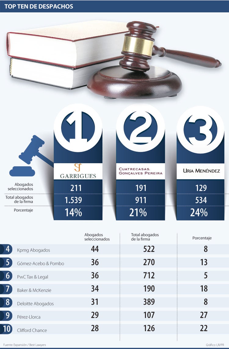 Con 211 abogados entre los mejores, Garrigues se sitúa en lo más alto de la clasificación superando a Cuatrecasas, Gonçalves Pereira -líder en la dos últimas ediciones-, con 191, y a Uría Menéndez, con 129 letrados en la élite, que obtienen la plata y el bronce, respectivamente.