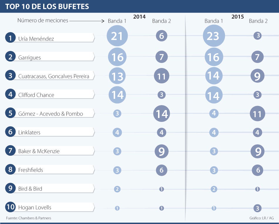 Sin embargo, y a pesar de que los bufetes españoles se sitúan en lo más alto de la tabla (ya que a excepción de Clifford Chance, el quinto puesto lo ocupó otro español, Gómez-Acebo & Pombo), lo cierto es que en el top ten las firmas internacionales son mayoría, ya que en la segunda mitad de la tabla se sitúan, por este orden: Linklaters, Baker & McKenzie, Freshfields, Bird & Bird y Hogan Lovells.