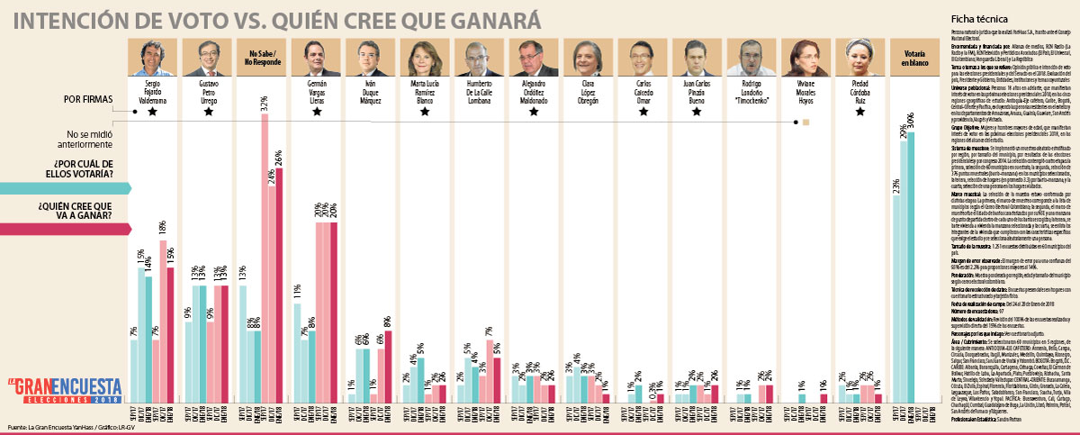 De acuerdo con los resultados de La Gran Encuesta realizada por YanHaas, 14% de los 1.251 encuestados votarían por el exgobernador de Antioquia, cifra en la que Fajardo subió con respecto a septiembre de 2017, mes en el que apenas siete de cada 100 colombianos le hubieran dado su voto.
