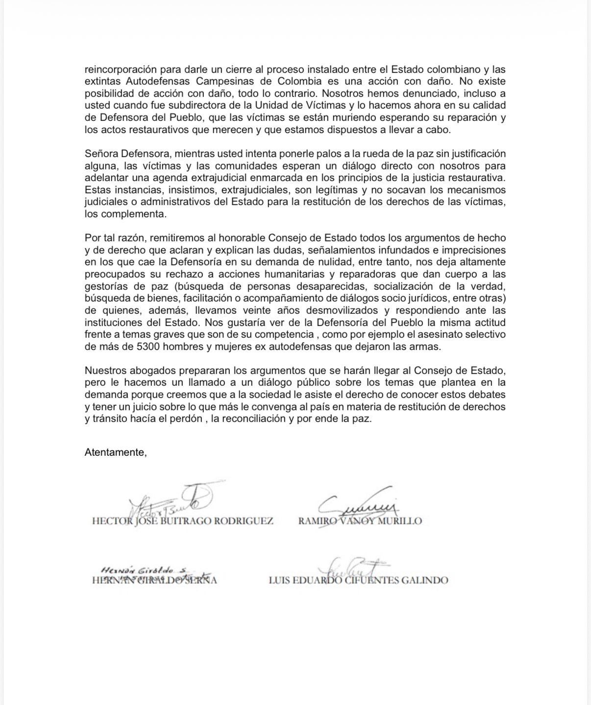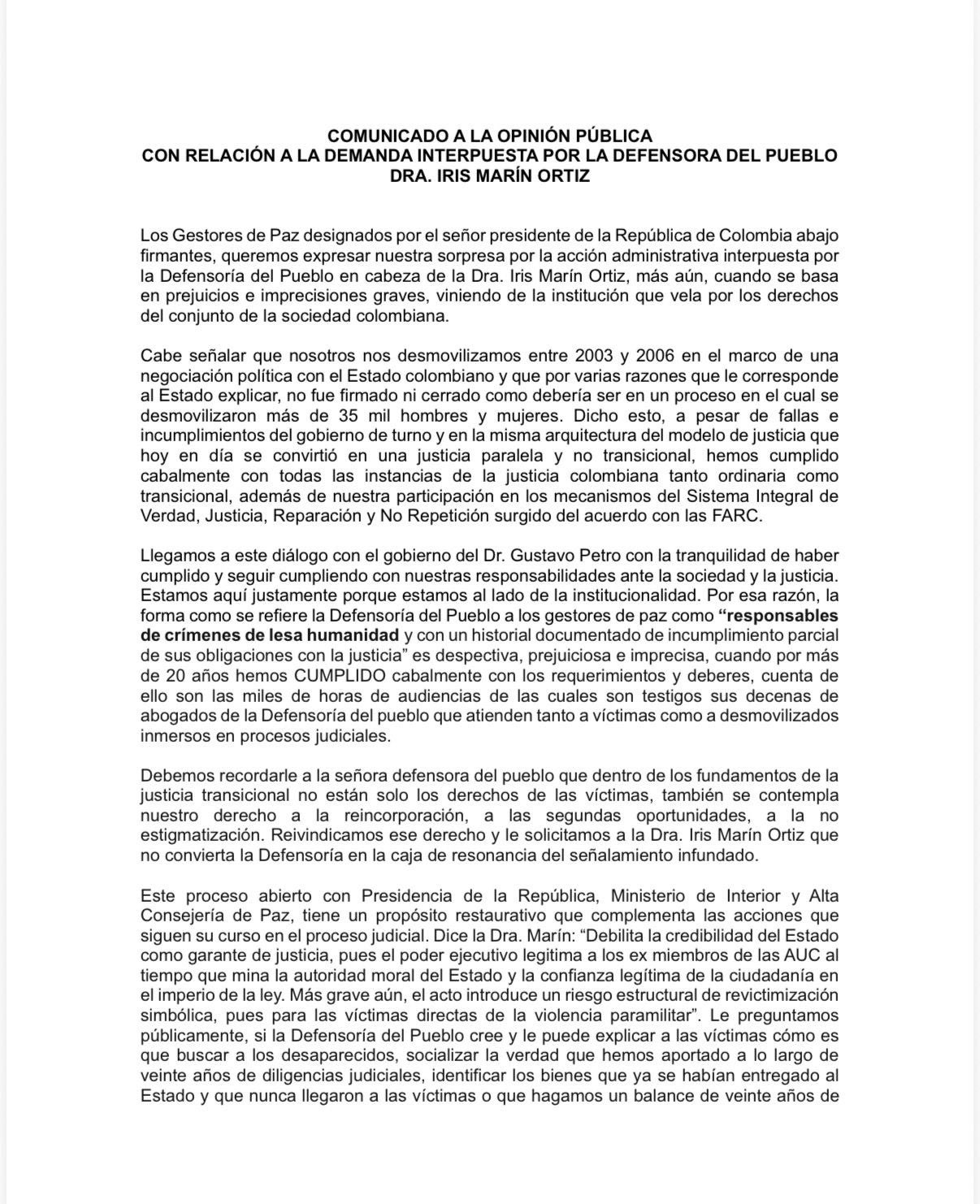Los gestores de paz sostuvieron que esta demanda está basada ”en prejuicios e imprecisiones graves, viniendo de la institución que vela por los derechos del conjunto de la sociedad colombiana”.