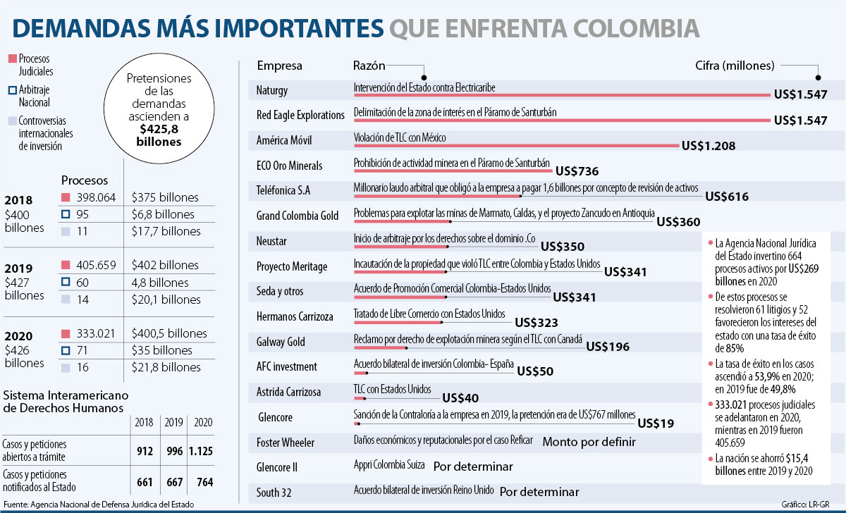 Puntualmente se trata del caso de América Móvil y Glencore que, según el reporte de la Agencia Jurídica, tienen pretensiones contra el Estado por US$1.547 millones y US$1.208 millones, respectivamente.