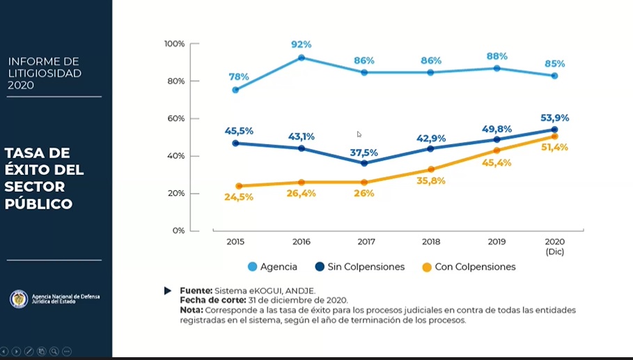 Pese a esta percepción, Gómez Alzate resaltó que la Agencia Jurídica ha implementado estrategias para tener avances en procesos de intervención y obtener los mejores resultados. De hecho, al 31 de diciembre de 2020 se logró una tasa de éxito de 85%.