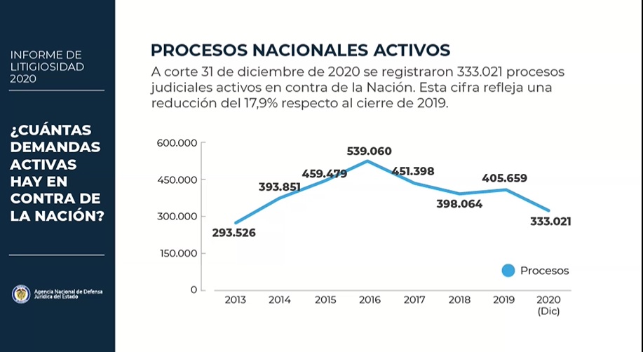 El ahorro que representó estas intervenciones por parte de la Agencia Jurídica llegó a $15,4 billones de ahorro para la nación entre 2019 y 2020. Del mismo modo, por el efecto de la pandemia, los procesos judiciales en 2020 se redujeron de 405.659 a 333.021 en 2020, cifra que refleja una disminución de 17,9% respecto al cierre de 2019.