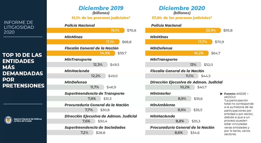 Las instituciones también fueron mencionadas en el reporte, ya que según el recuento del año pasado la Policía Nacional, el Ministerio de Minas y el Ministerio de la Defensa generaron importantes sumas por pretensiones de demandas.