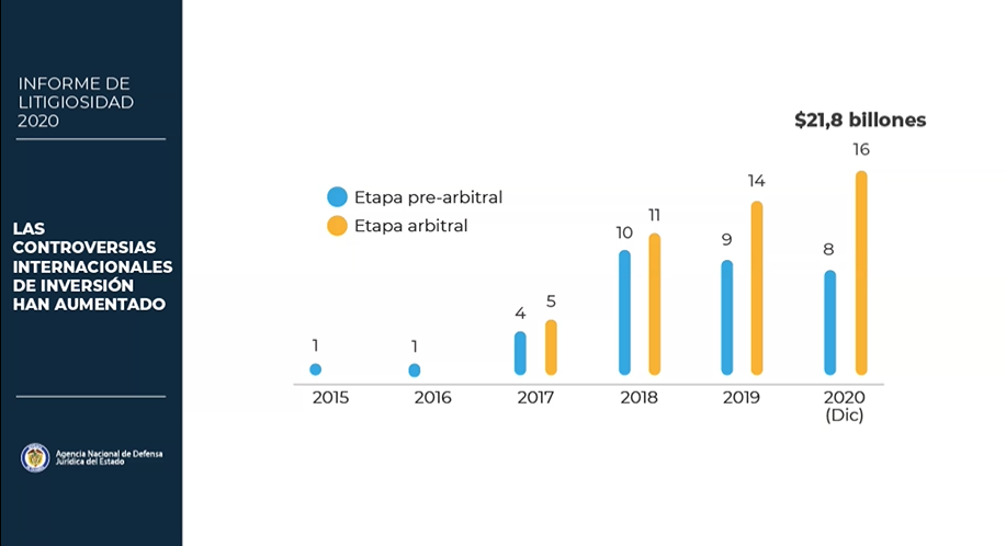 La Agencia Nacional de Defensa Jurídica del Estado anunció que cinco disputas legales de carácter internacional entre empresas y el Estado colombiano, de las 16 que están vigentes, serán definidas en el primer semestre de este año.