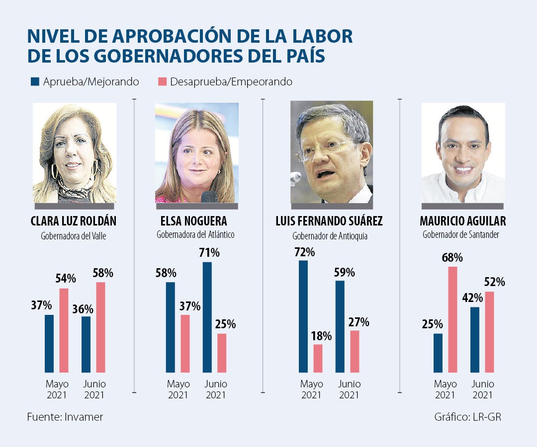 La desaprobación más alta registrada para este periodo fue la de la gobernadora del Valle, Clara Luz Rodán, quien obtuvo 58% en los resultados, es decir, subió 4% con respecto a los resultados del mes anterior.