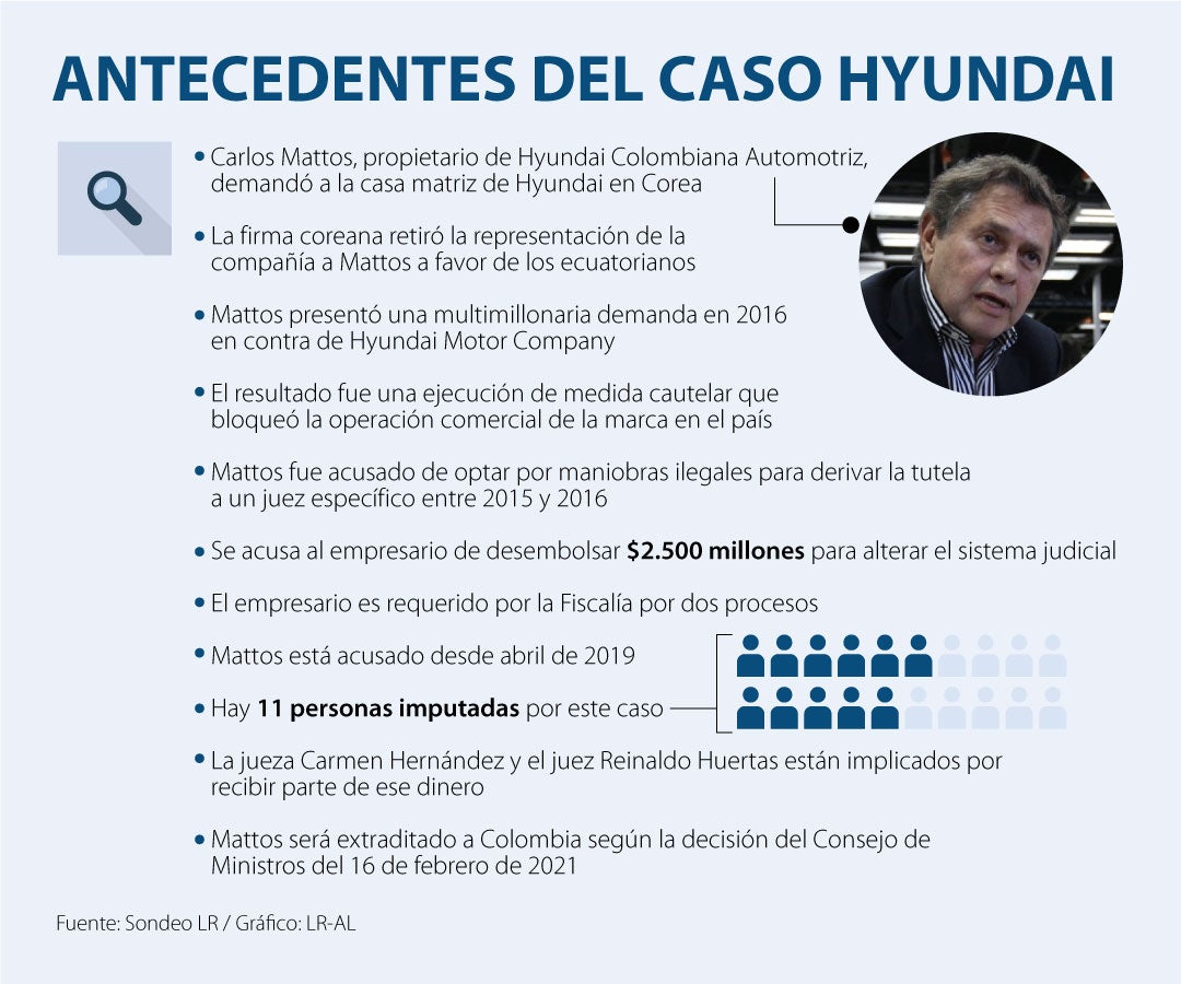 El empresario Carlos Mattos es solicitado por la justicia colombiana por ser acusado de sobornar a dos jueces de la República para tener la exclusividad de comercialización de vehículos de la marca Hyundai. El Consejo de Ministros le comunicó a la Cancillería que se avaló la extradición de Mattos para comparecer ante la justicia.