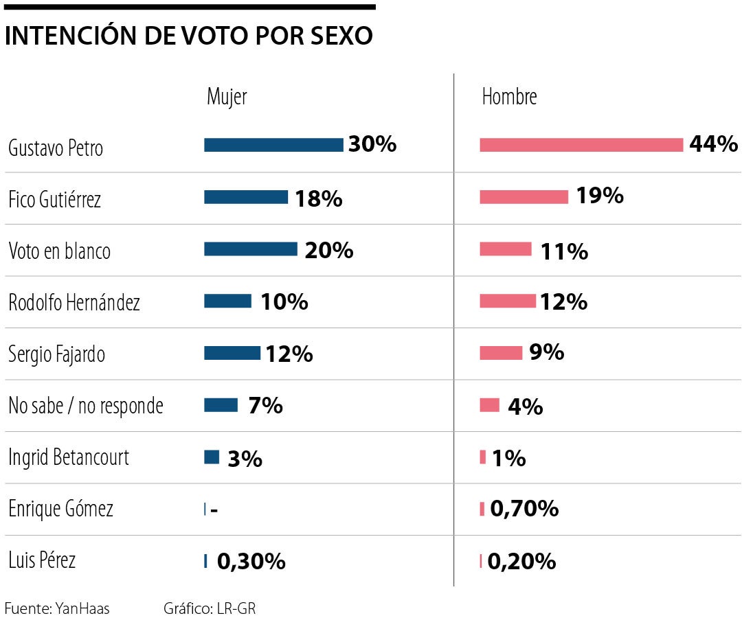El candidato del Pacto Histórico, Gustavo Petro, lidera la intención de voto tanto en hombres como en mujeres ya que se registró 44% maculino y 30% femenino. Le sigue el candidato de Equipo por Colombia, Federico Gutiérrez, quien alcanzó una intención de voto de 19% masculino y 18% femenino.