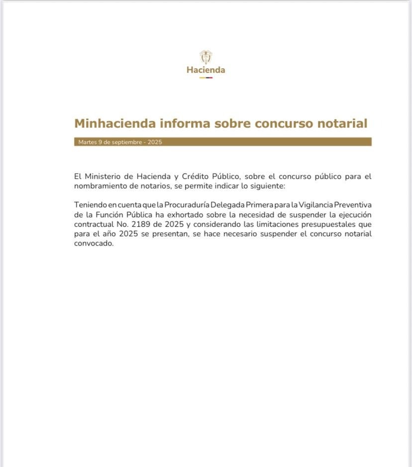 Ante esto, el ministro de Hacienda, Germán Ávila, confirmó esta suspensión del concurso notarial ante el requerimiento que fue interpuesto por parte de la Procuraduría.