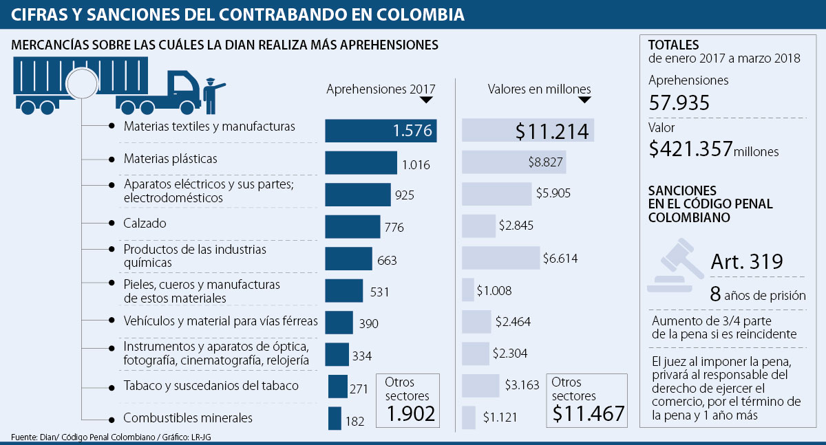 Vale la pena recordar que, según lo reportado por la Dian, solamente entre enero de 2017 y marzo de 2018, la entidad realizó cerca de 58.000 aprehensiones de mercancía por un valor superior a $421.357 millones, que pudieron entrar a competir en el mercado y además constituir nuevos negocios a través del lavado de activos.