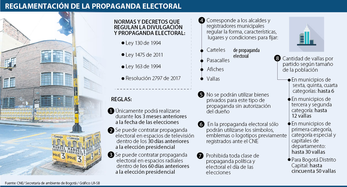 “Para el caso de Bogotá, según el decreto 814 de 2017, por ejemplo, la Alcaldía permite propaganda política solamente en las vallas permitidas por la ley, es decir 50 en Bogotá por partido o movimiento político, una con las normas medioambientales vigentes para cada sede del partido o de campaña y un máximo de cinco vehículos con la propaganda. Además, está prohibido fijar este tipo de propaganda en espacio público, como paredes, postes, semáforos y mucho menos en sitios o monumentos históricos”, explicó Óscar Ducuara, subdirector de publicidad exterior visual de la Secretaría de Ambiente de Bogotá, sin embargo esto no siempre se cumple.