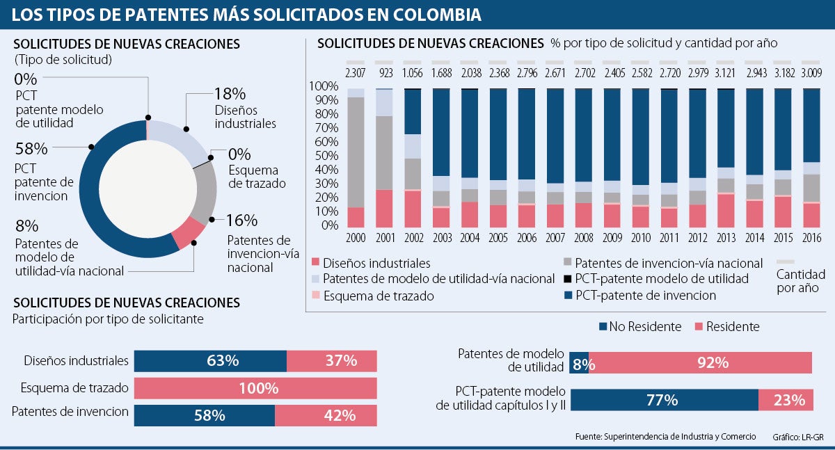 El más reciente reporte sobre información en materia de propiedad intelectual realizado por la Superintendencia de Industria y Comercio, en conjunto con la World Intellectual Property Organization (Wipo) y la Dirección Nacional de Derecho de Autor (Dnda), entre otras instituciones, reveló que 100% de las solicitudes de invenciones de esquemas de trazado son presentadas por residentes locales, y que solamente en 2016 se hicieron 3.009 solicitudes de patentes, trámites que pueden tomar hasta 20 meses, una cifra positiva frente a la región.