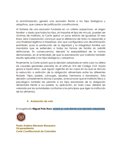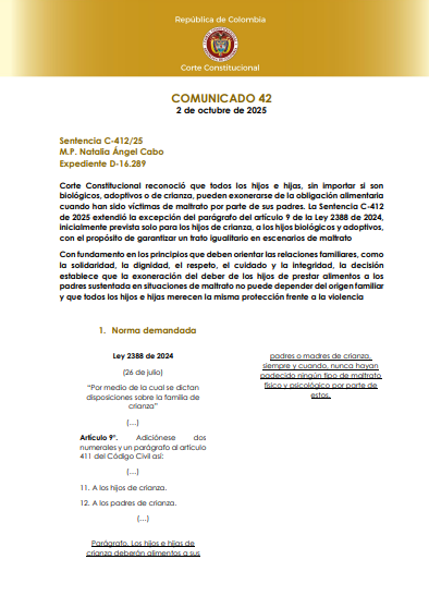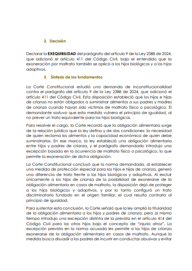 En pro de garantizar derechos justos en pro de la vida, la Corte amplió el alcance de la Ley 2388 de 2024. La norma original le permitía únicamente a los hijos de crianza que se exoneraran de la obligación alimentaria hacia apoderados que se encontraran en situación de vulnerabilidad, si estos los llegaron a maltratar.