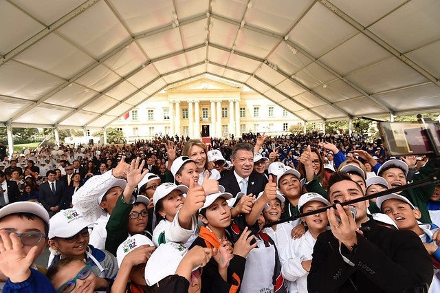 “Hoy es un día muy especial y eso que están haciendo, pintando a nuestro país en paz, coincide con un día muy especial. Acá está mi señora terminando los bordes de la palabra paz, dándole los últimos retoques, eso exactamente es lo que están haciendo los negociadores en este momento en La Habana. Dándole los últimos retoques porque hoy espero darle una noticia histórica muy importante sobre todo para todos los niños de Colombia”, dijo el mandatario.
