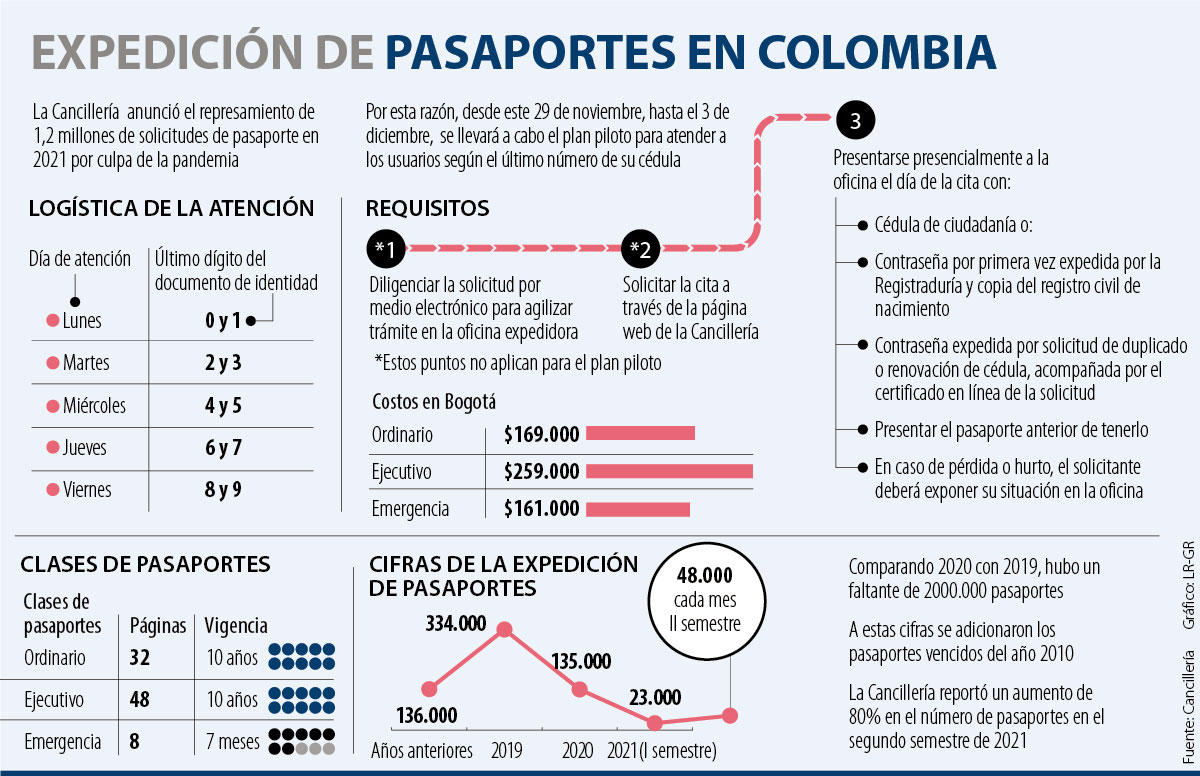 Vale la pena recordar que existen tres tipos de pasaportes. El primero es el ordinario, que cuenta con 32 páginas y una vigencia de 10 años; su costo, solo en la ciudad de Bogotá, es de $169.000. En segundo lugar está el pasaporte ejecutivo que, con un precio de $259.000, tiene 48 páginas y vigencia de una década. Por último, está el de emergencia, que tiene un costo $161.000 con una duración de siete meses y cuenta con ocho páginas.