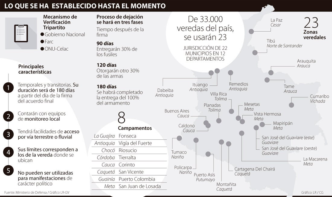 Así mismo, se definió que en los campamentos no podrá haber población civil y habrá restricción del porte de armas. En cuanto al proceso de dejación, según Juan Manuel Charria Segura, constitucionalista de la Universidad Javeriana, explicó que se definió que sería en tres fases. “Se entregará 30% los primeros 90 días del acuerdo, a los 120 días otro 30% y a los 180 días se habrán desarmado en 100%”, precisó.