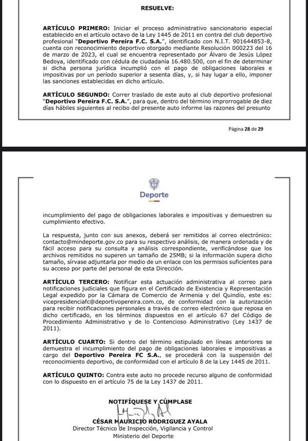 Debido a la crítica situación financiera del Deportivo Pereira, el Ministerio del Deporte le otorgó a López un plazo de 10 días hábiles para demostrar que no se presentaron atrasos superiores a 70 días en el cumplimiento de las obligaciones laborales e impositivas; de lo contrario, se suspenderá el reconocimiento deportivo del club.