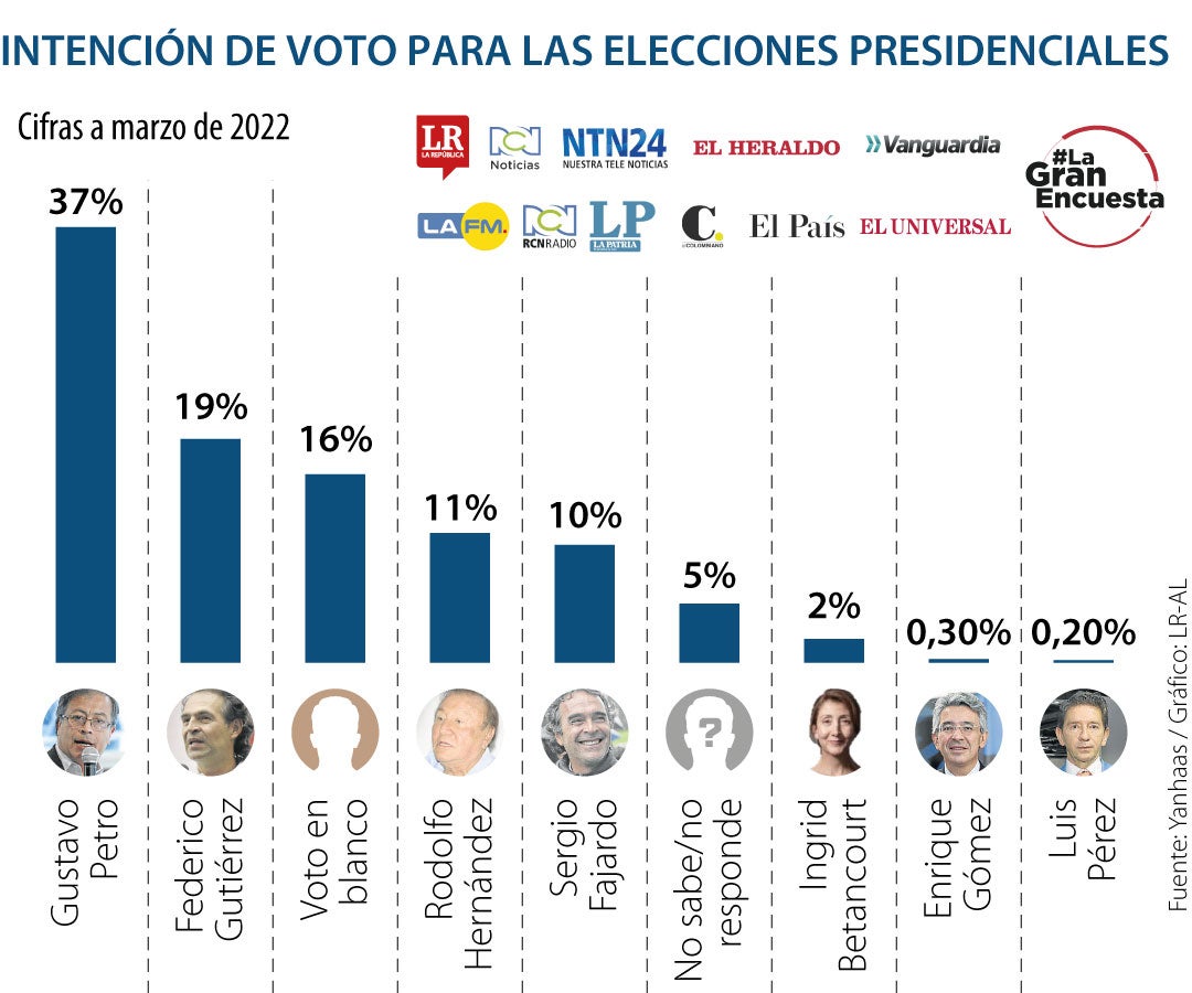 No obstante, hay que tener en consideración, también, a los que piensan votar en blanco y a los indecisos. Según el sondeo de Yanhaas, los primeros cuentan con 19% y los segundos con 5%, sumando un total de 24%, suficiente para que, en caso de que se inclinen por un candidato, sea determinante para alcanzar, e incluso para sobrepasar al líder del Pacto Histórico.
