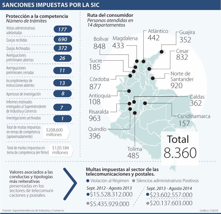 La Superintendencia de Industria y Comercio (SIC) ha impuesto $120.184 millones en total de multas en tema de competencia, que están en firme, durante el periodo comprendido entre el primero de septiembre de 2013 y el 31 de agosto del presente año, según el informe de rendición de cuentas 2014 de la entidad, publicado el día de ayer. En total en el mismo periodo ha sancionado a diferentes compañías por $150.000 millones.