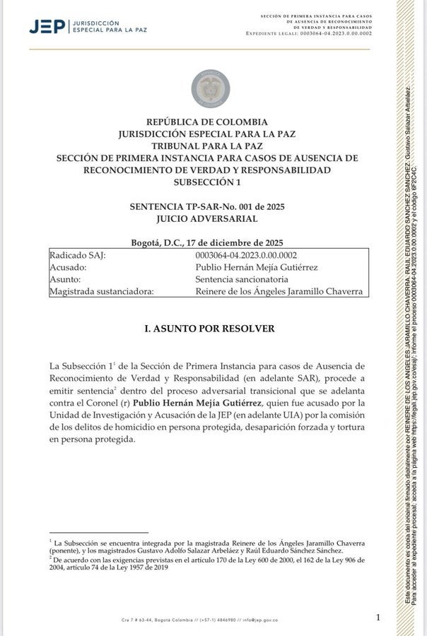 La Sección de Primera Instancia de la Jurisdicción Especial para la Paz, JEP, encontró al coronel en retiro, Publio Hernán Mejía Gutiérrez, penalmente responsable de 72 casos de falsos positivos a manos del Batallón de Artillería La Popa de Valledupar, mientras ejerció como su comandante, y lo condenó a 20 años de prisión.