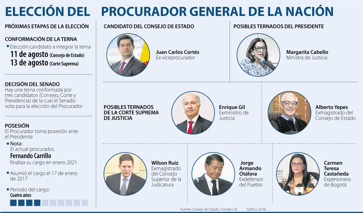 El segundo integrante de la terna, el nominado por la Corte Suprema de Justicia, se conocerá mañana jueves 13 de agosto. A pesar de que hay 20 aspirantes en el listado para asumir la dirección del organismo, los nombres que más suenan son: Enrique Gil Botero, exministro de Justicia; Wilson Ruíz, exmagistrado del Consejo Superior de la Judicatura; Alberto Yepes, exmagistrado del Consejo de Estado; Jorge Armando Otálora, que se desempeñó como Defensor del Pueblo entre 2012 y 2016; y Carmen Teresa Castañeda, quien hasta febrero se desempeñó como Personera de Bogotá.