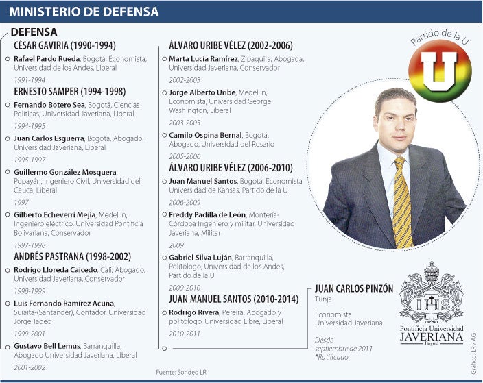 El ministro de Defensa Juan Carlos Pinzón fue ratificado ayer para acompañar en el segundo periodo de gobierno a Juan Manuel Santos, quien tomará posesión mañana a las 3:00 de la tarde. Es el jefe de cartera número 16 desde 1991 y el tercero del Partido de la U. El primer mandatario hizo el anuncio durante el aniversario 195 del Ejército Nacional.