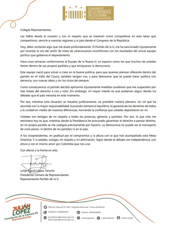El representante a la Cámara, Julián López, en medio de una jornada llevada a cabo hoy en las instalaciones del organismo, se amarró a su curul con un letrero en que se leía “nos pueden intentar callar pero no podrán apagar la verdad. A mi familia, a mis amigos y al país les digo: vamos Pa’ lante”, en forma de protesta contra el Partido de la U. No obstante, mientras persistía su manifestación, anunció a través de una carta, que no seguirá presidiendo la corporación mientras avanza el proceso interno.