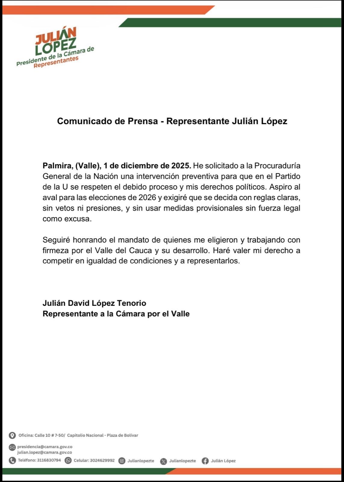 Después de que el presidente de la Cámara de Representantes, Julián López, fuese censurado de voz y votos y se le fuese quitado su aval en el Partido de la U, López, a través de un comunicado le solicitó a la Procuraduría General de la Nación una intervención para que se le sea devuelta el apoyo de la U.