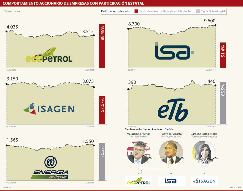 Tal es el caso de Ecopetrol, ISA e Isagen, compañías que tienen participación estatal de 88,49%, 51,40% y 57,67%, respectivamente, y que luego de las elecciones presidenciales en las cuales el país cambiará de rumbo para los próximos cuatro años, podrían verse afectadas por los cambios en las juntas directivas y por la nueva estructuración que supondrá un nuevo gobierno.