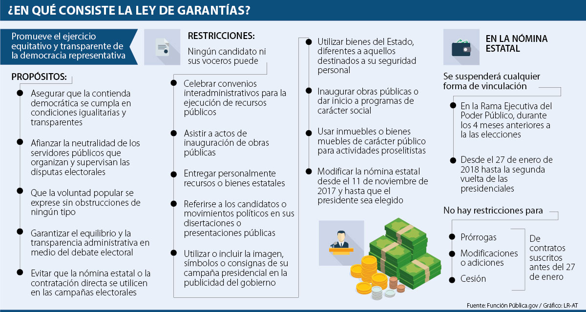 La Ley de Garantías, que empieza cuatro meses antes de las elecciones al Congreso, tiene como propósito asegurar que la contienda democrática se cumpla en condiciones igualitarias y transparentes. Para ello impide, entre otras cosas, suspender las contrataciones con el Estado salvo en casos de prórrogas, modificaciones o cesiones de contratos (ver gráfico).