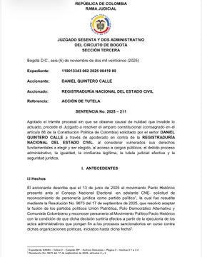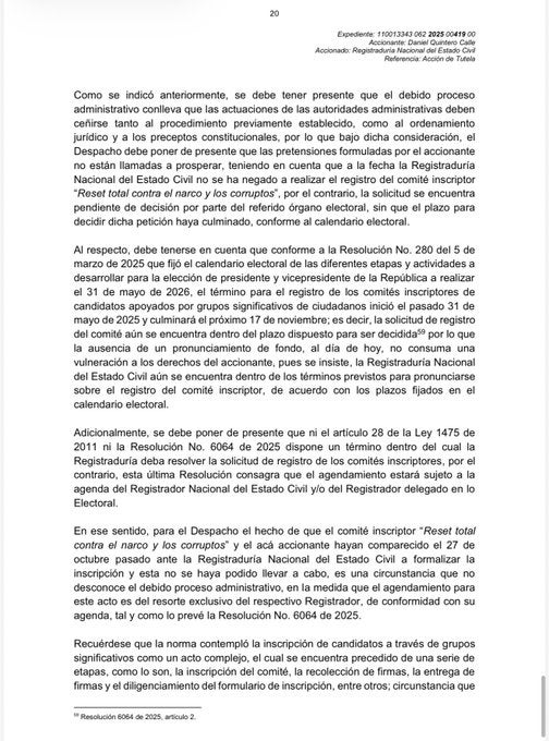 No obstante, el juez encargado del caso pudo concluir que, hasta el momento la entidad registradora no ha tomado una decisión certera frente a su participación en las elecciones del 2026, pues la Registraduría tiene hasta el 17 de noviembre para proporcionar una respuesta definitiva. También sostuvo que no existe una demora ilegal, ya que ni Ley 1475 de 2011 ni la Resolución 6064 de 2025 establecen un plazo exacto para responder solicitudes de inscripción a comités.