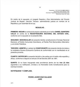 De esta manera el Juzgado sesenta y dos Administrativo del Circuito de Bogotá, resolvió frente a esta acción, negar la solicitud hecha por Quintero en contra de la Registraduría teniendo en cuenta lo sucedido. También de “Desvincular del trámite constitucional al Consejo Nacional Electoral, al Partido Comunista Colombiano, al Partido Polo Democrático Alternativo y a la Unión Patriótica”, y admitir en calidad de coadyuvante de la tutela a Ximena Echevarría Cardona.