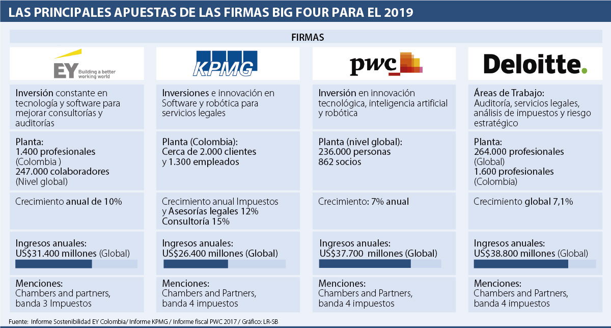Las cuatro principales firmas en asesoría y consultoría conocidas como las Big Four a nivel global (EY, Kpmg, Deloitte, PwC) están innovando dentro del mercado colombiano y le apuestan a ganar un espacio en el sector legal. Así, entre las estrategias está que EY afianza sus servicios legales y diversifica su plataforma de asesorías para conquistar otros mercados. PwC, invierte en ciberseguridad, tecnología e innovación dentro de sus procesos. La firma Kpmg, invertirá en software y robótica, y cree que el panorama económico en turismo y agroindustria representa una gran oportunidad.