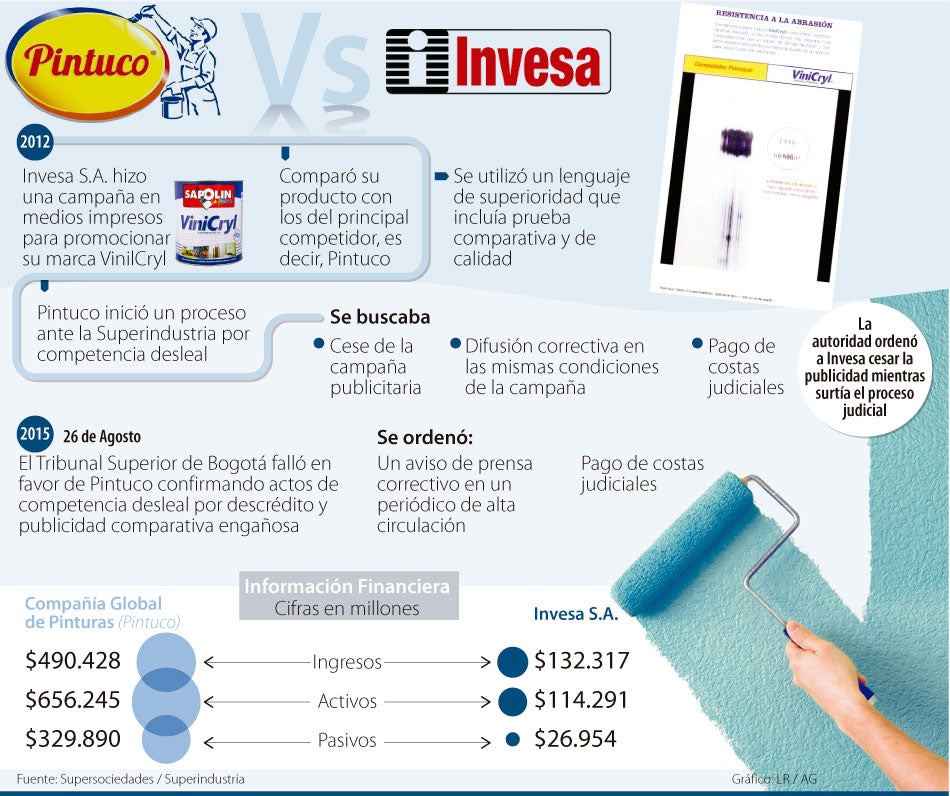 En cuanto al proceso legal, el Tribunal Superior del Distrito Judicial de Bogotá falló el 26 de agosto de este año, en favor de Pintuco confirmando actos de competencia desleal por descrédito y por publicidad comparativa engañosa. Consuelo Benjumea, socia de Consuelo Benjumea y Asociados y abogada de Pintuco, indicó que “Invesa debe cumplir con lo ordenado por dicho Tribunal, en el sentido de rectificar la publicidad comparativa en un diario de amplia circulación y pagar las costas que ordene pagar la Superintendencia de Industria y Comercio”.