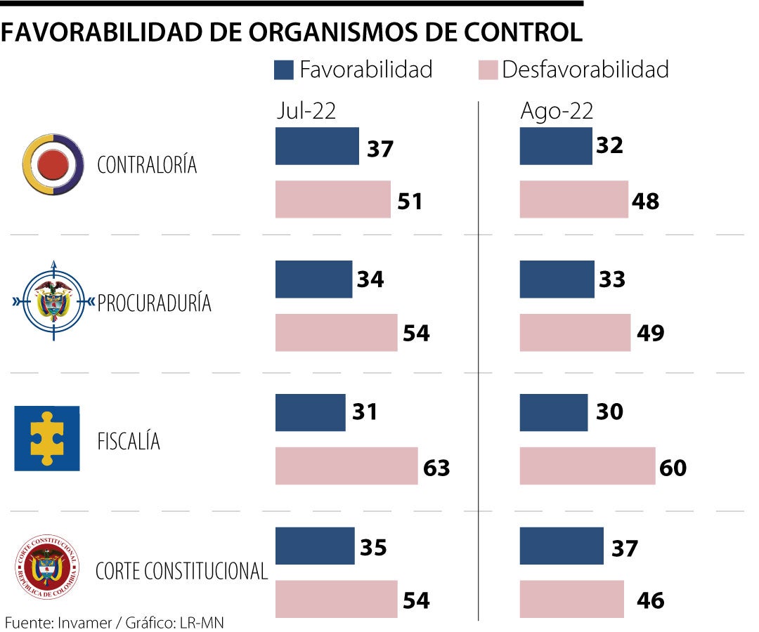 Los diferentes entes de control fueron evaluados mediante la encuesta de Invamer Poll, donde entre todos los segmentos que tiene se encuentra la desfavorabilidad de los organismos de control. Interesante perspectiva, debido a que la encuesta anterior se realizó en el marco del Gobierno de Iván Duque, mientras que, la encuesta de agosto con el Gobierno entrante de Gustavo Petro.