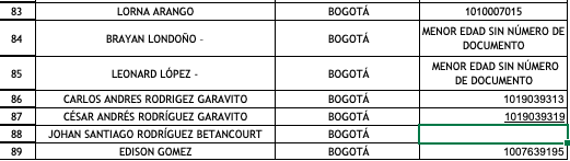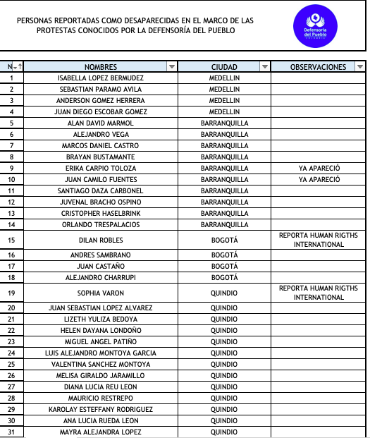 La Defensoría del Pueblo, que lidera Carlos Camargo, informó que activó la fase de investigación de 89 denuncias de casos de personas desaparecidas (dos ya aparecieron) que fueron reportados al organismo desde que iniciaron las protestas en el territorio nacional el pasado miércoles 28 de abril.