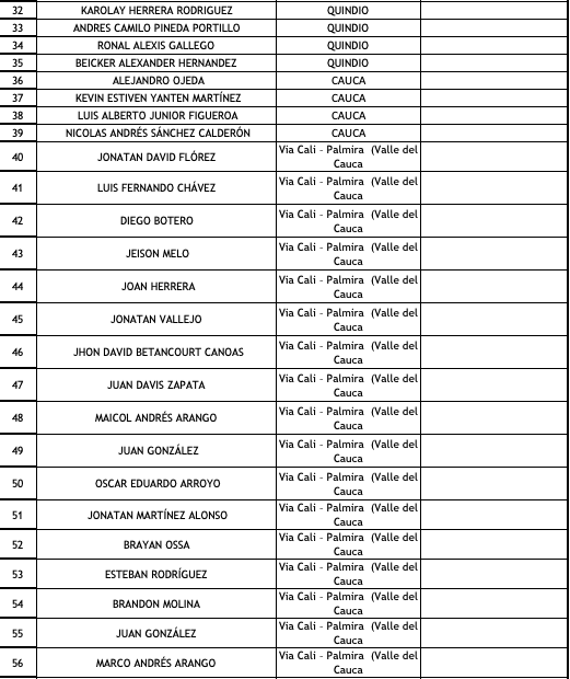 El resto de los casos de desapariciones reportadas se distribuye así: 18 casos en Bogotá, 17 en Quindío, 8 en Barranquilla, 4 en Medellín y 4 en Cauca.