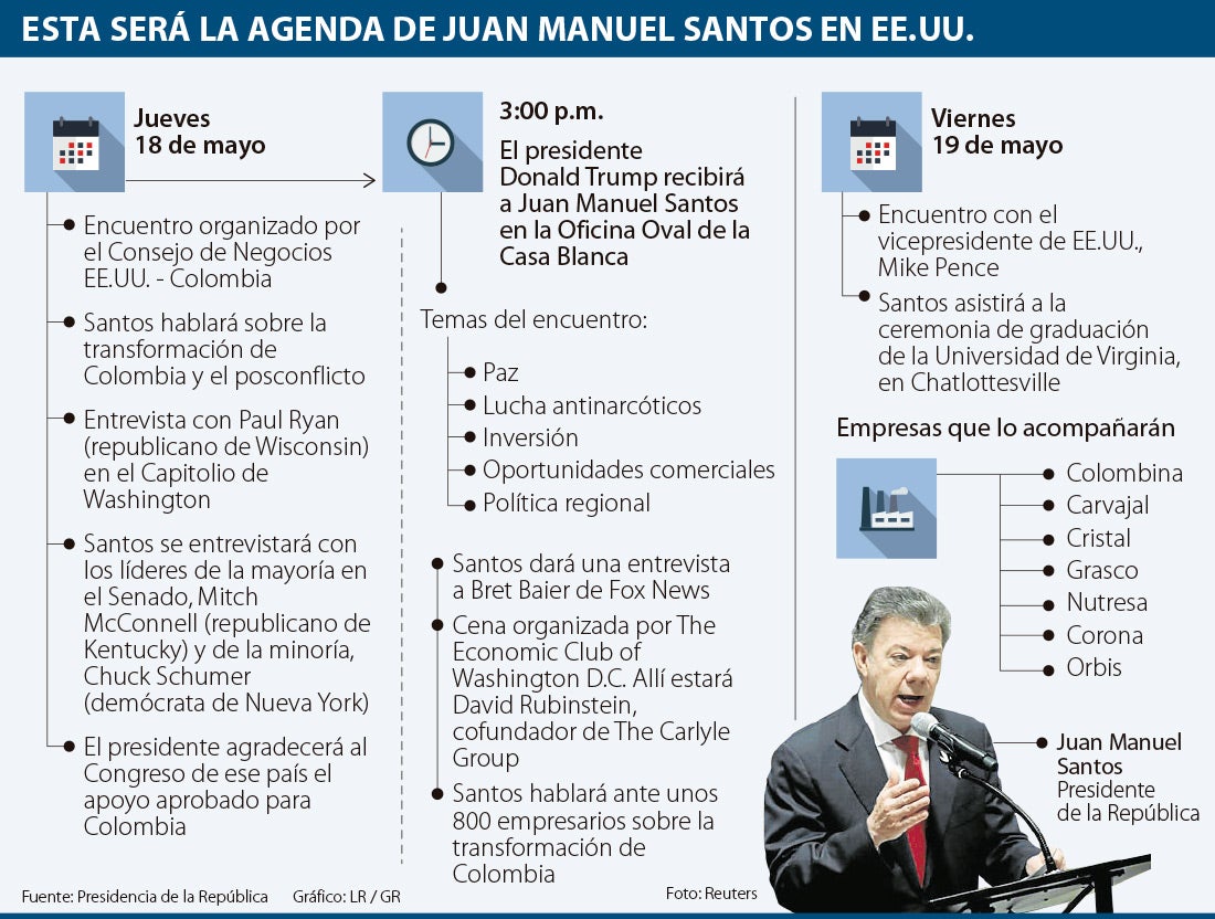 Cabe destacar que el presidente Santos también se reunirá con el vicepresidente Mike Pence, el secretario de Estado, Rex Tillerson; y el secretario de Comercio, Wilbur Ross, lo que, en palabras del embajador del país en EE.UU., Juan Carlos Pinzón, demuestra que “Colombia es el aliado más fuerte de Estados Unidos en América Latina, y esta reunión es fundamental para fortalecer aún más los vínculos entre los dos países”.