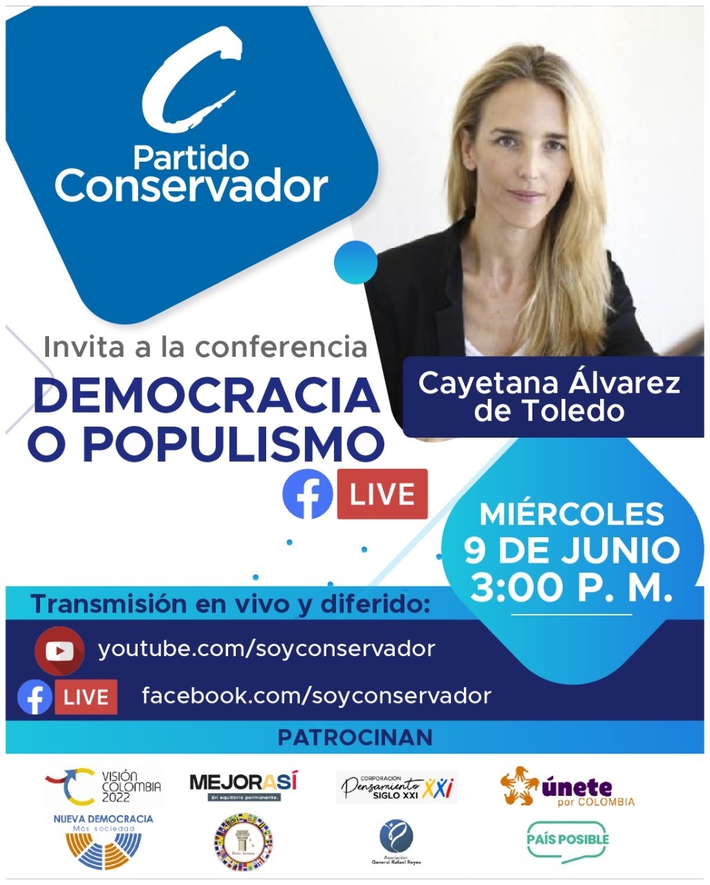 El próximo miércoles 9 de junio a las 3:00 p.m. el Partido Conservador hará la conferencia “Democracia o Populismo”, un encuentro virtual que contará con la política, historiadora y periodista española Cayetana Álvarez de Toledo como protagonista.