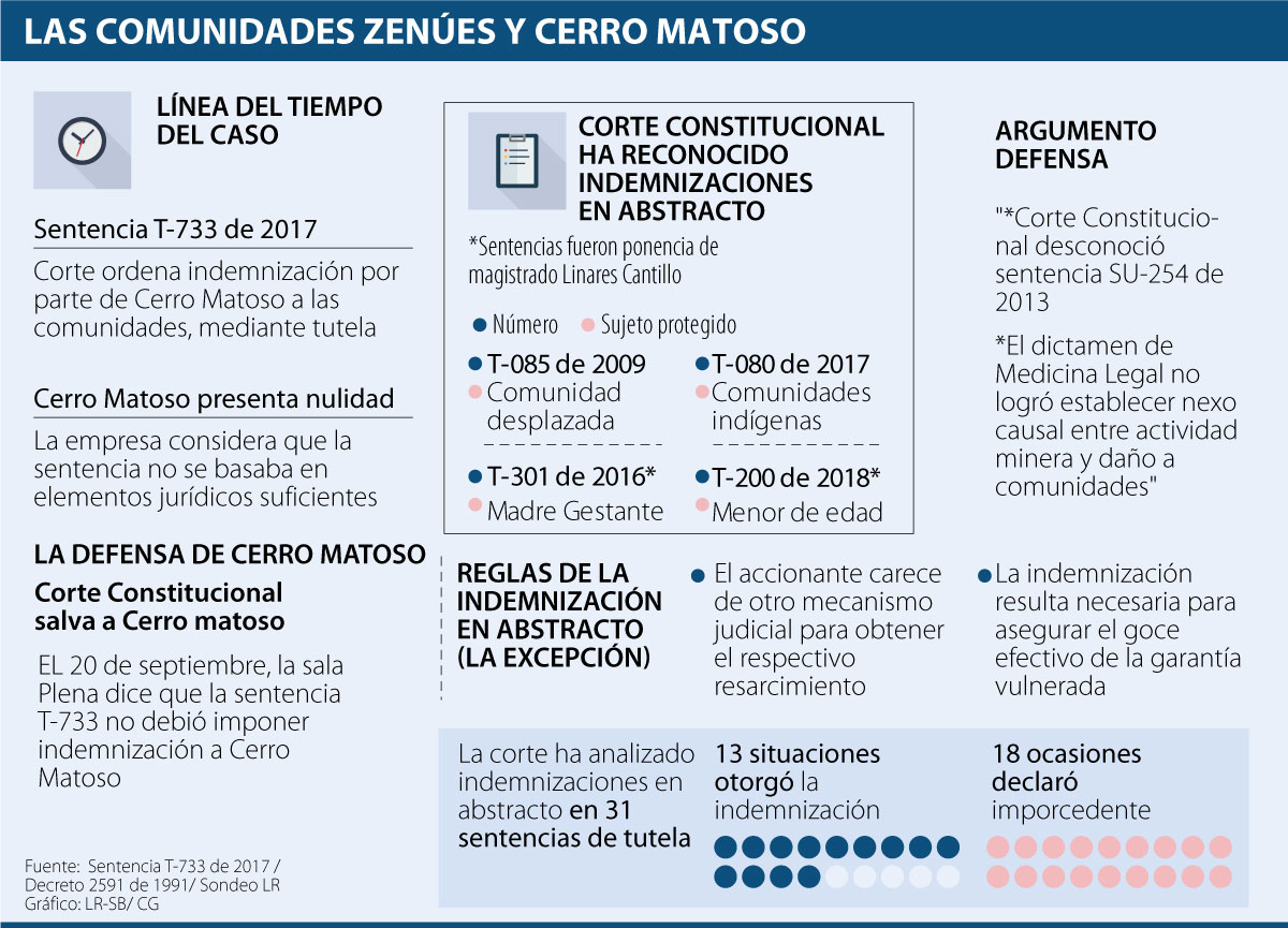 La Sala Plena de la Corte Constitucional anuló la sentencia T-733 de 2017, mediante la cual se reconocía una millonaria indemnización (US$400 millones) contra la empresa Cerro Matoso, por generar supuesta afectación a la salud de las comunidades zenúes del Alto San Jorge y otros grupos indígenas. Sin embargo, la Corte obligó a la empresa minera a realizar un proceso de consulta previa y a renovar su licencia ambiental para poder seguir operando en la zona. Durante el proceso, dos magistrados se declararon impedidos.