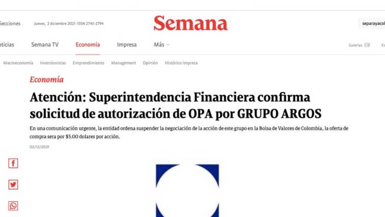 Desde hace días circula en redes un montaje con el logo de la Revista Semana de una supuesta solicitud de OPA para adquirir el Grupo Argos