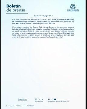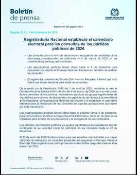 A su vez, el 4 de diciembre se vence el plazo para que, “en caso de que se solicite la realización de consultas para la escogencia de candidatos a la presidencia de la República, los precandidatos se postulen ante la Registraduría Nacional”.