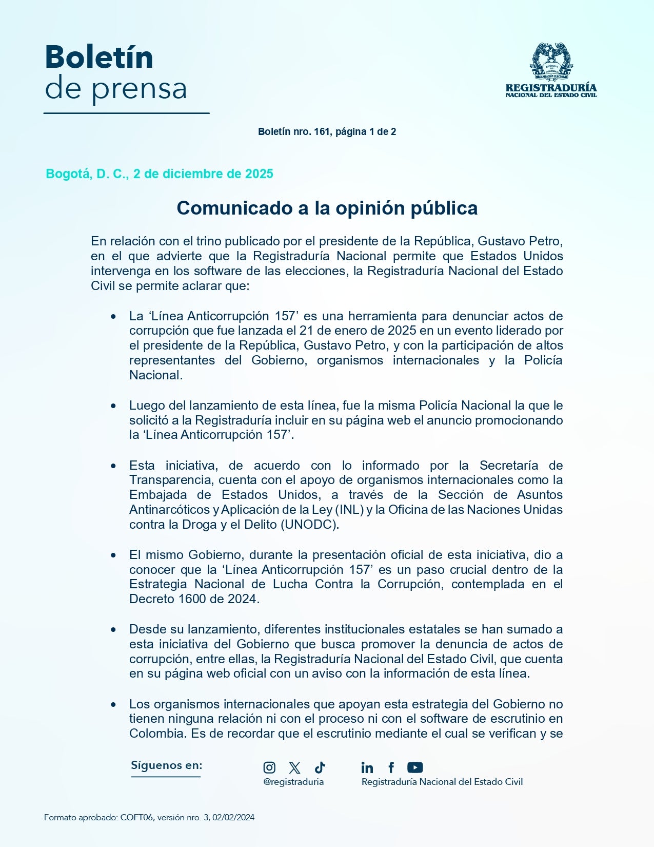 "Luego del lanzamiento de esta línea, fue la misma Policía Nacional la que le solicitó a la Registraduría incluir en su página web el anuncio promocionando la ‘Línea Anticorrupción 157’", agregó.