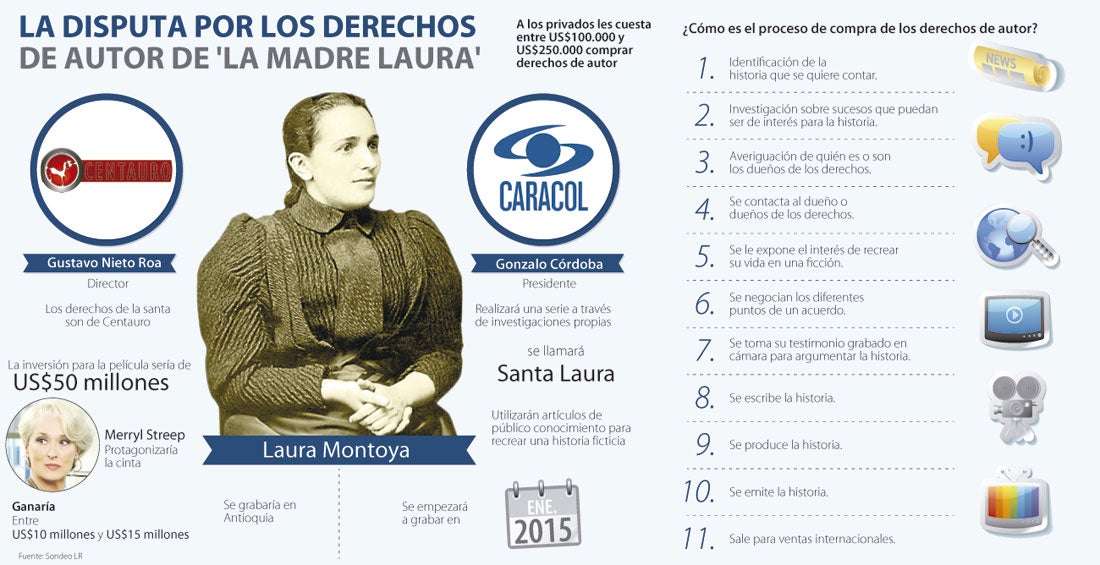 En cuanto al rifirrafe que se ha dado entre las dos empresas, producto de los derechos, el director de Centauro aseguró que no existe un pleito oficial o legal, porque no se conoce a fondo qué tipo de producto está desarrollando Caracol. Insistió en que solo él está autorizado legalmente, para hacerle la radiografía a la vida de la religiosa.“Hace poco una persona nos llamo a la productora a decirnos que estaba haciendo un documental para el canal privado sobre la madre Laura, y que tenían US$1.000 como pago por la información que requerían de nosotros. Les respondimos que teníamos que reunirnos, ver qué era lo que iban a hacer y discutir sobre los derechos de autor, que son míos. Sin embargo hasta la fecha no se han vuelto a comunicar”.