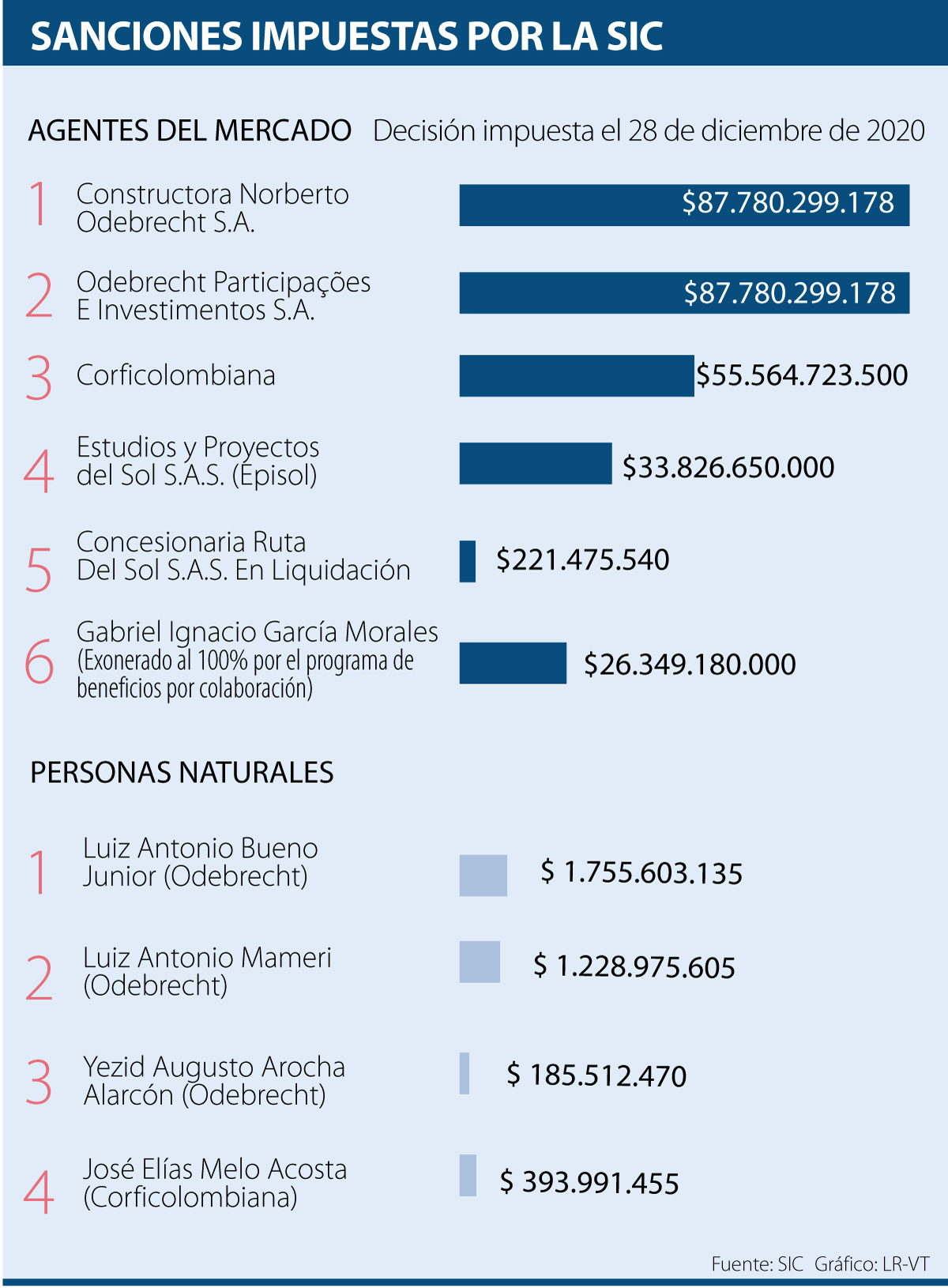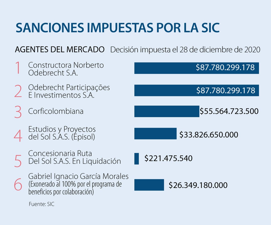 La sanción fue para seis agentes del mercado (Constructora Norberto Odebrecht S.A., Odebrecht Participações E Investimentos, Corficolombiana, Episol, Concesionaria Ruta Del Sol S.A.S. en Liquidación y Gabriel Ignacio García Morales) y para cuatro personas naturales (Luiz Antonio Bueno Junior, de Odebrecht; Luiz Antonio Mameri, de Odebrecht; Yezid Augusto Arocha Alarcón, de Odebrecht; y José Elías Melo Acosta, de Corficolombiana).