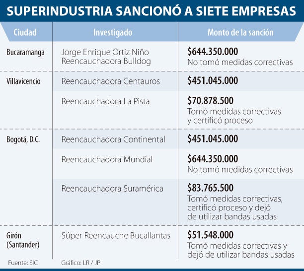 En Bogotá, las sanciones para Continental, Mundial y Suramérica fueron de $451 millones, $644,3 millones y $83,7 millones, respectivamente. La reencauchadora Mundial no tomó medidas correctivas, mientras que Suramérica tomó medidas correctivas, certificó el proceso y dejó de utilizar bandas usadas. Para el caso de Bucallantas, reencauchadora de Girón, Santander, la sanción fue de $51,5 millones, pues la empresa tomó medidas correctivas y dejó de utilizar bandas usadas.
