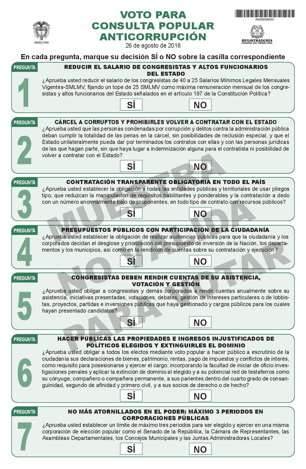 El tarjetón cuenta con siete preguntas en las que se busca reducir el salario de congresistas; dar cárcel a corruptos; establecer un límite de máximo de tres periodos elegido; exigir contratación transparente; rendir cuentas de asistencia, entre otras.