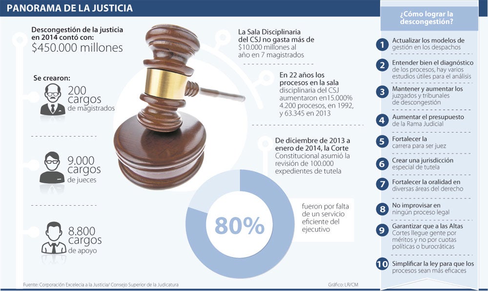 Dice Gloria Borrero, directora de la Corporación Excelencia en la Justicia, que el Consejo Superior de la Judicatura debe empezar a entender mejor el diagnóstico de los procesos, “hay varios estudios que contribuyen con el análisis de los casos, pero al parecer en el Consejo no los están analizando adecuadamente”. El presupuesto aprobado para 2015 de la Rama Judicial fue de $3,3 billones y dice Carlos Andrés Echeverry, constitucionalista de la Universidad Javeriana, que habría que engrosar la cifra, entre otras cosas, para crear nuevos juzgados y mantener los de descongestión, que se han ido desmontando gradualmente. El presupuesto, de hecho, es uno de los puntos que está motivando el paro de 25.000 funcionarios de la Rama y Freddy Machado, presidente de la Asociación nacional de Funcionarios y Empleados de la Rama Judicial (Asonal), aseguró a Colprensa que “el presupuesto para el sector siempre es improvisado. No hay dinero para implementar el Código de Procedimiento Penal, la reforma al Código Penitenciario y otros. En Cartagena $1.000 millones que había para construir el Palacio de Justicia, se utilizaron para la planta de descongestión”.
